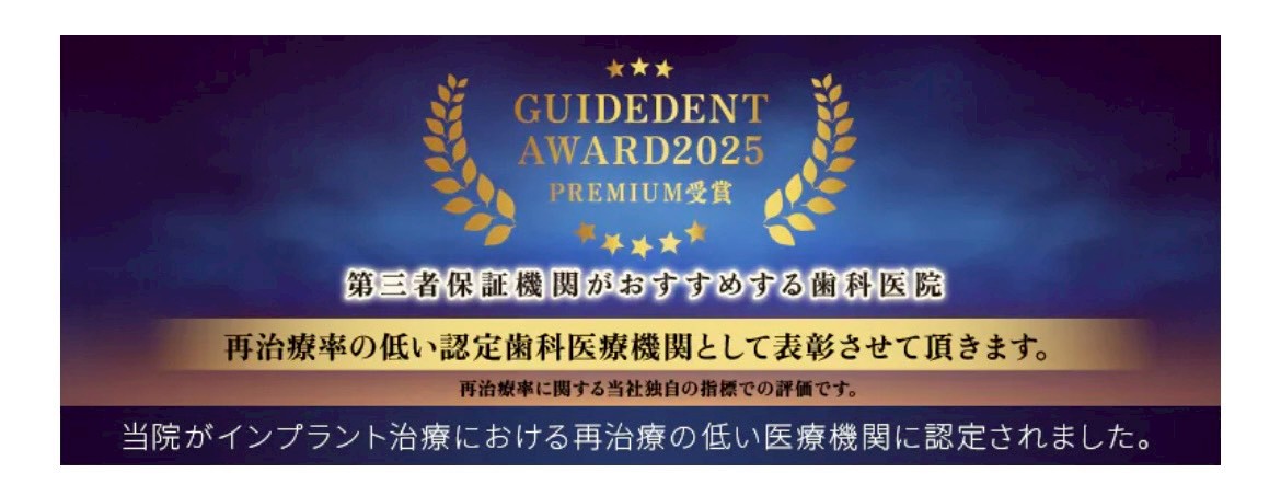 当院はインプラント保証機関 「ガイドデント」 から、インプラント治療の再治療率が低い医療機関 として認定を受けています。