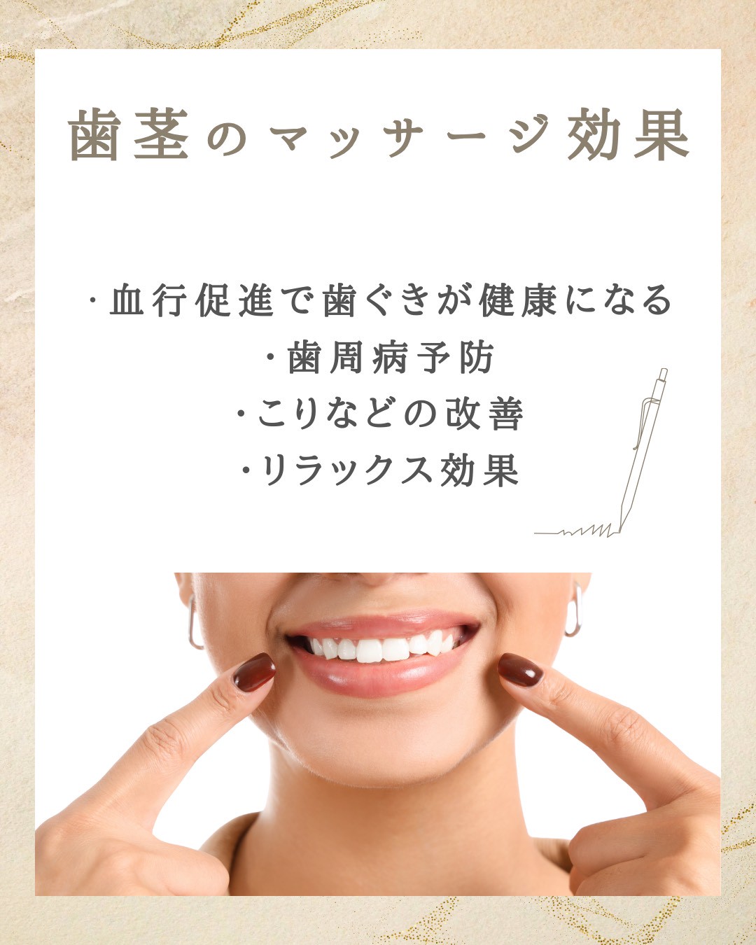 歯ぐきには多くの血管があり、やさしく刺激を与えることで血流が良くなり、歯周病予防やむくみ改善に役立ちます。