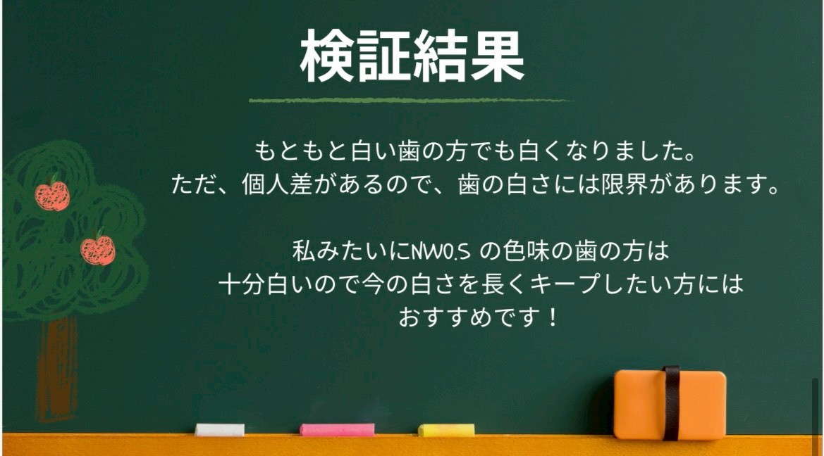 私の感想は、今の色NW0を長期間キープしたいならもうこれ以上は白くならないと思いますが、もう1回はホワイトニングをやってみようかなと思います!!